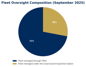 Understanding the makeup of the U.S. towing vessel fleet is essential for interpreting deficiency trends. CWO Jimmy Collins of the TVNCOE states that the fleet currently includes 4,869 towing vessels. Of these, 3,512 operate under a TSMS certificate or Document of Compliance (DOC) issued by a TPO or Responsible Organization (RO), with 2,875 specifically under the TSMS-option. This means approximately 72% of the fleet is managed through third-party oversight, while the remaining 28% falls under the Coast Guard inspection option. This disparity in oversight models provides a meaningful context for comparing serious deficiency rates.